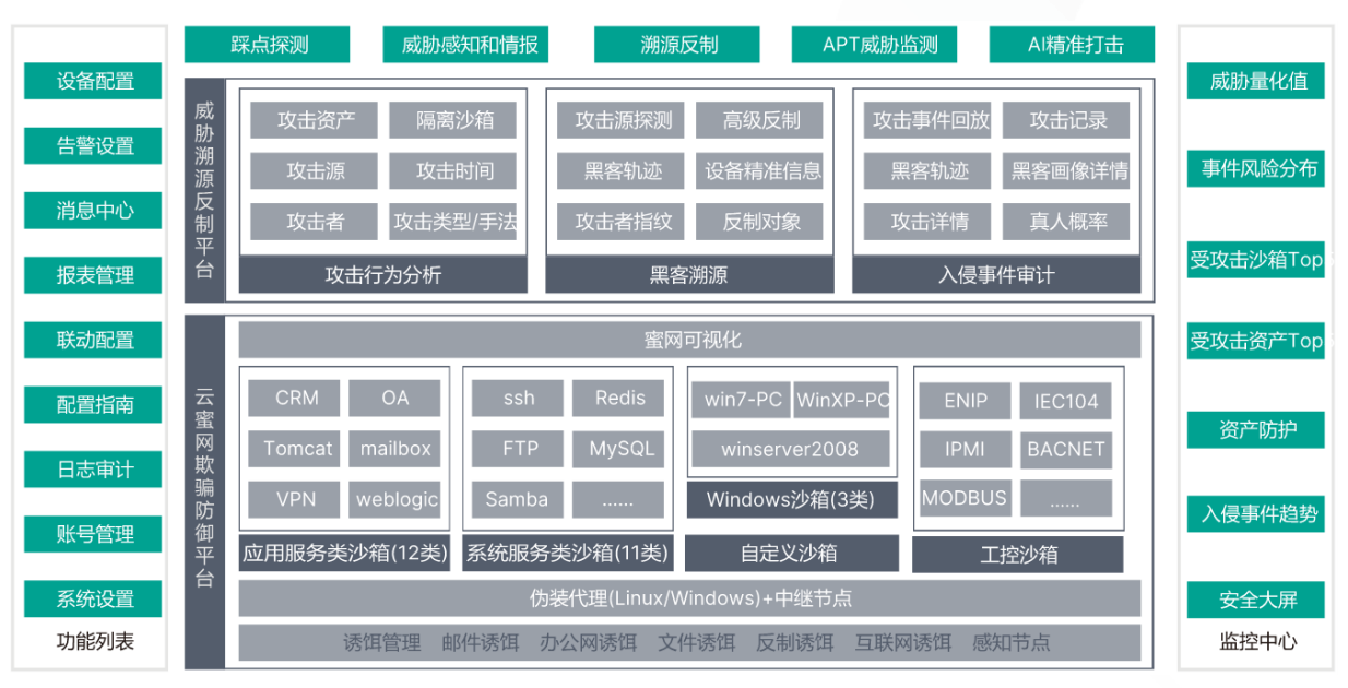 通过构建基于动态“欺骗诱捕”的精准检测防御体系,形成动态欺骗诱捕蜜网,实现精准威胁检测和安全告警0误报。