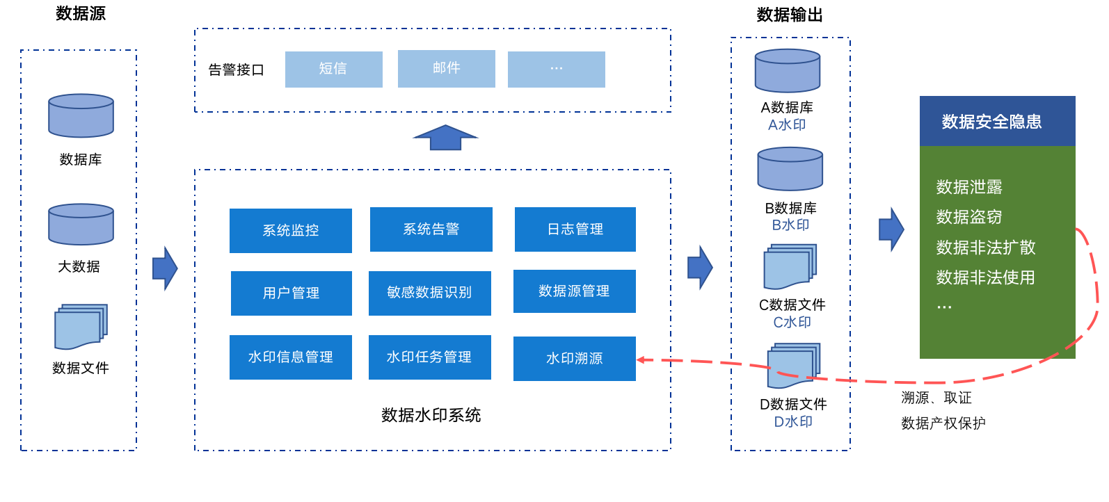 对于外发数据,可以打上特有水印数据,作为数据所有者的依据,从而达到数据版权保护,防止不法分子滥用、盗用数据。